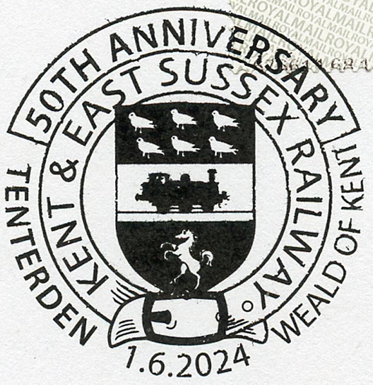 Oblitération du 1-6-2024 pour commémorer le 50e anniversaire du "Kent & East Sussex Railway".